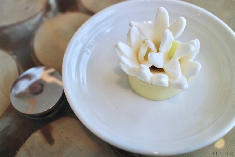そして今回一緒に頼んだのが写真を撮らずにはいられない「花咲くホットチョコレート」!自家製ホットチョコレートとは別にお皿に乗った白いお花が登場。こちらをホットチョコレートの上のせると…