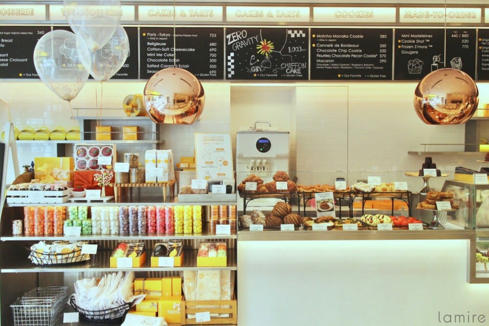 店内に入った瞬間、カラフルなお菓子やケーキ、ベーカリーがたくさん並んでいて誘惑の嵐!あれもこれも食べたくなってしまいます。
