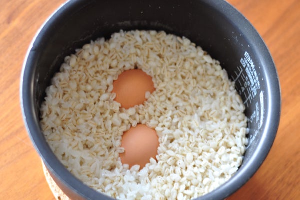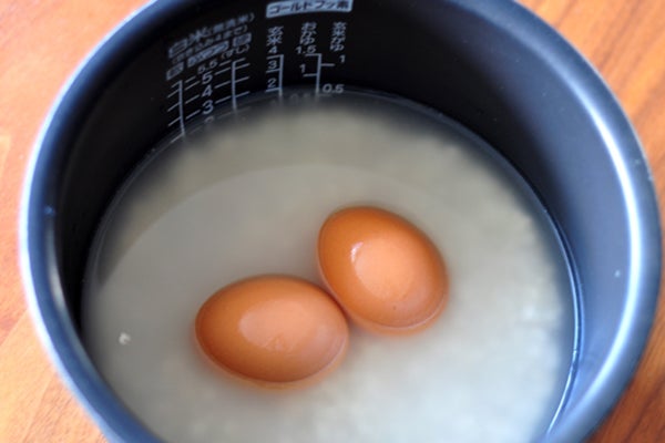 私はずっと前から、ゆで卵を作るのは炊飯器。お米と水を入れた炊飯器に卵をそのまま入れてスイッチオン。すると、炊き上がりと同時にゆで卵もできあがり!