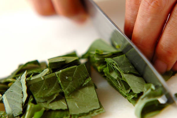 ・モロヘイヤは軸から葉だけを取り、サッと水洗いし、食べやすい大きさに刻む。
