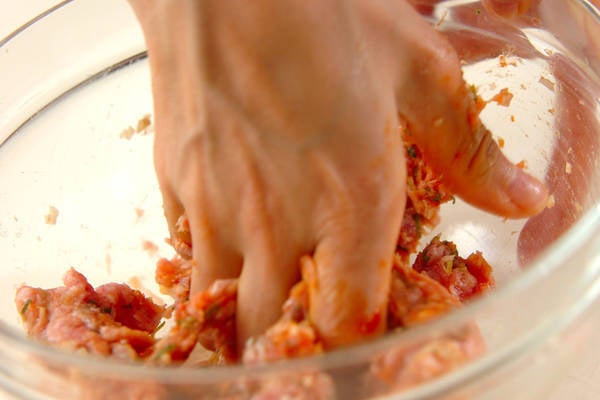 1、<肉団子>を作る。ボウルに豚ひき肉、刻みネギ、ショウガを入れ、<調味料>の材料を加えて粘りが出るまで、手でよく練る。