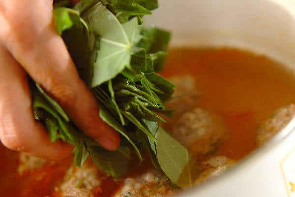 2、鍋に<スープ>の材料を入れて火にかけ、煮たったら(1)の<肉団子>を手で丸めて入れる。団子に火が通ったらアクを取り、モロヘイヤを加える。ひと煮たちしたら火を止め、器に注ぐ。