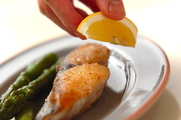 つけあわせのアスパラ、トマト、レモンが色鮮やかにサワラを引き立てます。お好みの野菜でももちろんOKです!