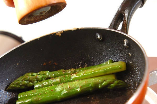 3、(2)のフライパンにグリーンアスパラを入れ、全体にバターがからまったら塩コショウを振る。