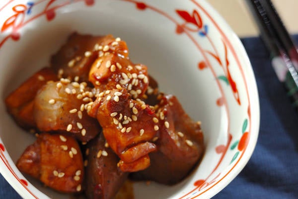 炒めたコンニャクと鶏もも肉を赤みそで味付けした甘辛いおかずは、ご飯やお酒と相性抜群です。パパッと15分ほどで作れて、「あともう一品欲しいなー」というときにも最適ですよ。汁気が少ないので、多めに作れば、翌日のお弁当のおかずとしても大活躍してくれそうですね。