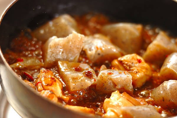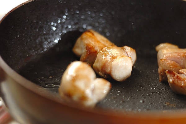1、フライパンにサラダ油を熱し、鶏もも肉を焼き色がつくまで炒め、板コンニャクを加えて炒め合わせる。