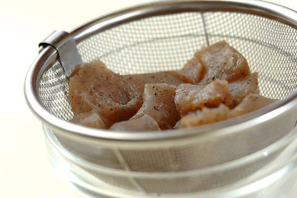 ・板コンニャクは手でひとくち大にちぎり、たっぷりの水と共に鍋に入れて強火にかけ、煮たったら1~2分ゆでてザルに上げる。