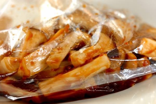 1、抗菌のビニール袋にエリンギと<下味>の材料を入れ、10分おく。揚げ油を170℃に予熱し始める。