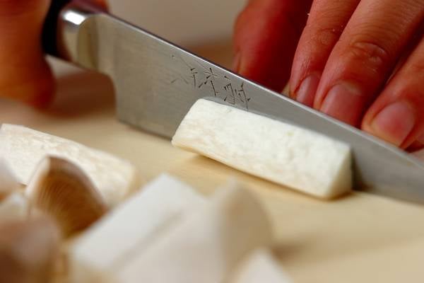 ・エリンギは長さを2~3等分に切り、さらに縦6~8等分に切る。ボウルで<衣>の材料を混ぜ合わせる。
