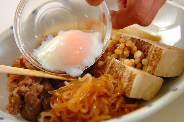3、全体にしんなりしたら器に盛り、温泉卵をのせて七味唐辛子を振る。