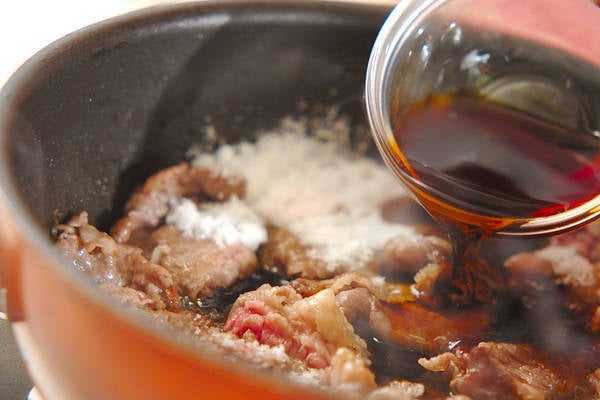 1、深めのフライパンにサラダ油を熱し、牛肉を炒める。色が変わったら<調味料>の砂糖、しょうゆ、酒を加える。