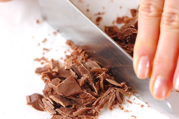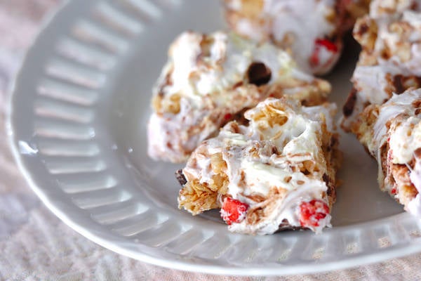 2、(1)が熱い間に刻んだチョコレートとシリアルを混ぜ合わせ、オーブンシートで包んで冷蔵庫で冷やす。固まったらナイフを水で塗らしながら食べやすい大きさに切って器に盛る。