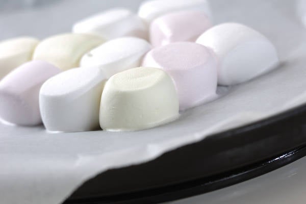 1、天板にオーブンシートを敷いてマシュマロをのせ、電子レンジにかけて溶かす。