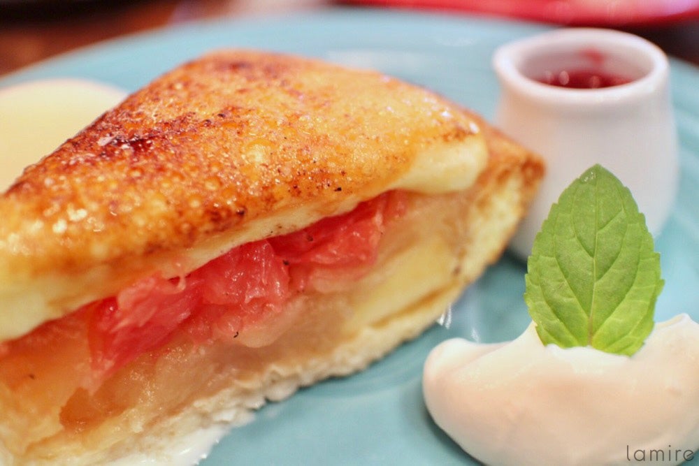 今回は青山店限定のシブースト アップルパイをいただきました。りんごと一緒にピンクグレープフルーツが入っているのです。アップルパイとピンクグレープフルーツ…そして更に両面をキャラメリゼしたシブースト…まったく想像もしたこのない組み合わせ。それが、ひと口食べた瞬間にすべてがマッチして、とても爽やかな味に!