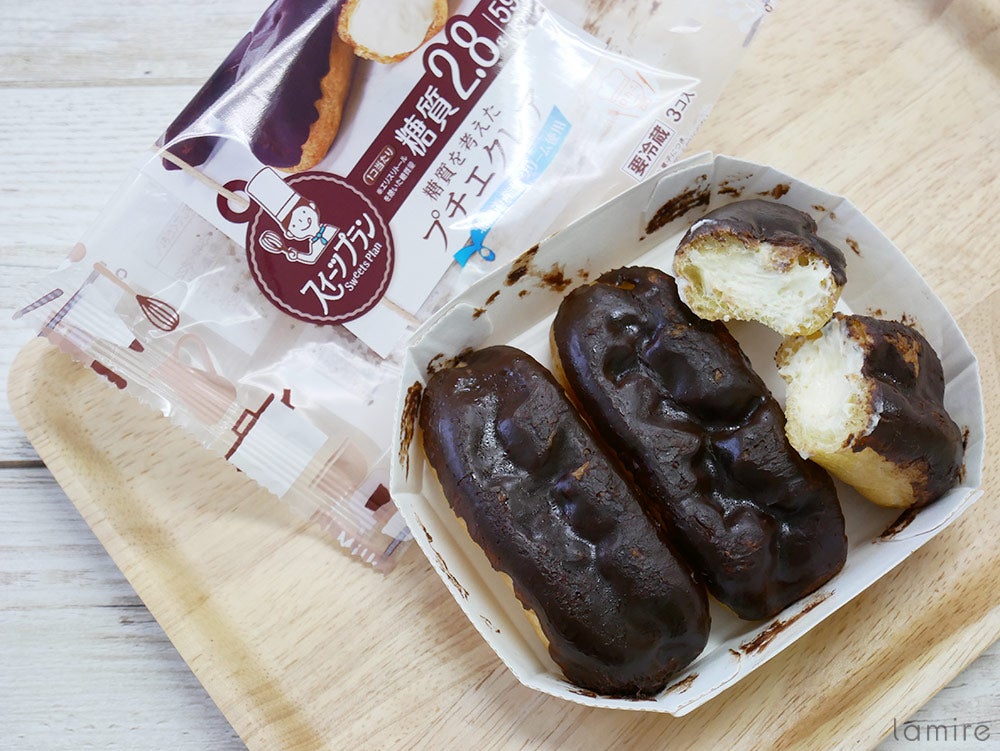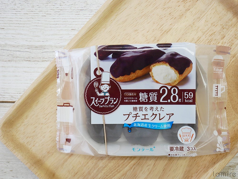 こちらは甘いもの好きにはたまらないプチエクレア3個入り。1個あたりの糖質は2.8g、カロリーは59kcalで、一袋全て食べても184kcal。