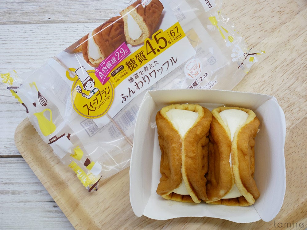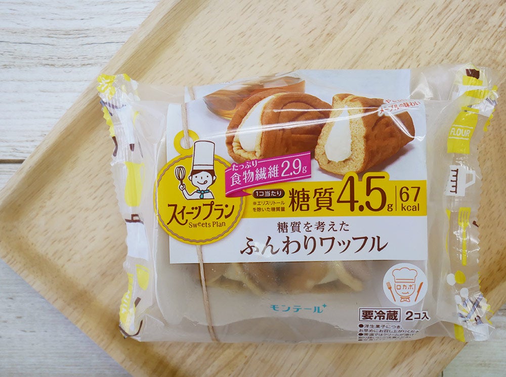 これは私のイチオシ!「糖質を考えたふんわりワッフル」です!一袋2個入りで、1個あたりの糖質は4.5g、カロリーは67kcalで、一袋食べてもわずか135kcal!