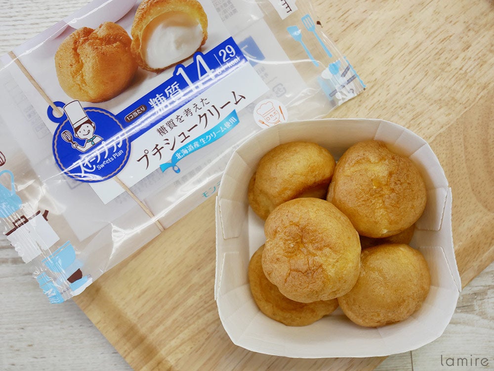 1つ目は一口サイズのシュークリームが6個入った「糖質を考えたプチシュークリーム」。1個あたりの糖質は1.4g、カロリーもわずか29kcalで、一袋全て食べても176kcalと罪悪感のない数値です。