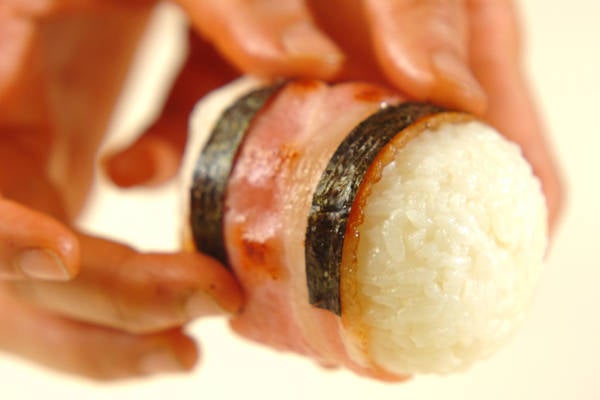 お肉や卵焼きにベーコン、お好みの具材で丸ごとおにぎりを包んでしまいましょう。