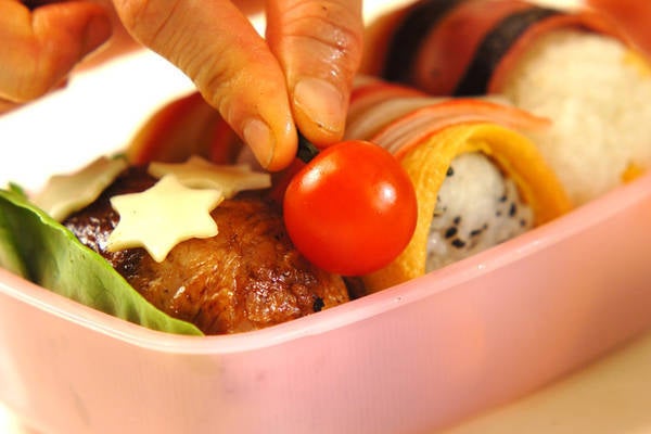 8、お弁当箱にサラダ菜を敷き、おにぎりを詰めてプチトマトを飾る。