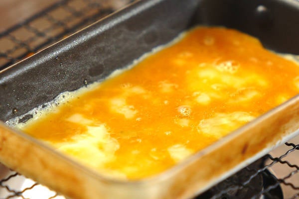 3、<卵巻きおにぎり>を作る。ご飯に塩と黒ゴマを混ぜ、ラップで俵型ににぎる。卵焼き器にゴマ油をひき、<卵巻きおにぎり/卵液>を流し入れて弱めの中火で薄焼き卵を作る。