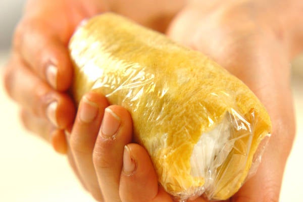 4、ラップで薄焼き卵をご飯に巻き、カニ風味カマボコを上にのせる。