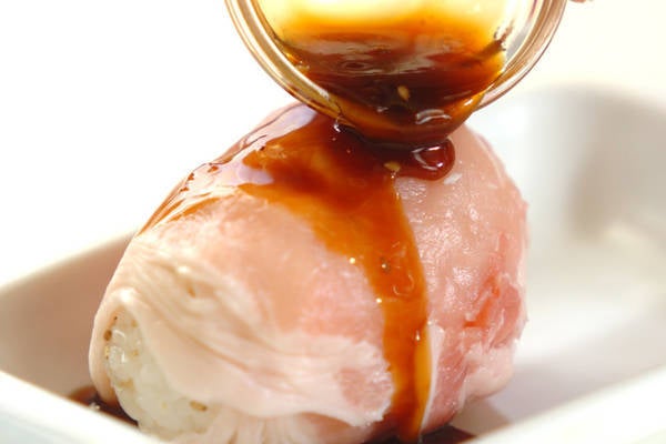 1、<肉巻きおにぎり>を作る。ご飯に塩と白ゴマを混ぜ、ラップで俵型ににぎる。豚肉をご飯にしっかり巻きつけ、焼き肉のタレをかけてサラダ油をひいたフライパンで巻き終わりがはがれてこないよう、中火で豚肉に火が通るまで焼く。
