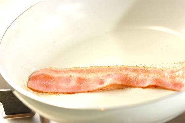 6、フライパンを弱火で熱し、ベーコンに塩コショウをして、じっくりと両面に焼き色をつける。