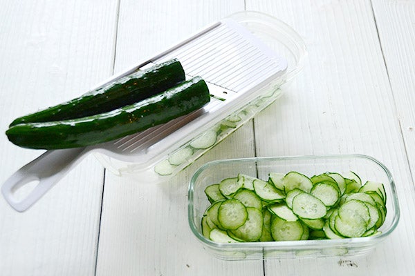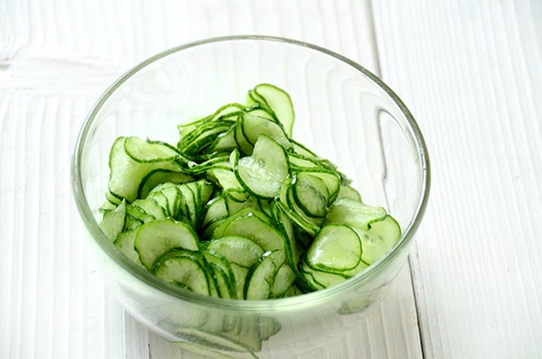 1、きゅうりをスライサーなどでうす切りにする。