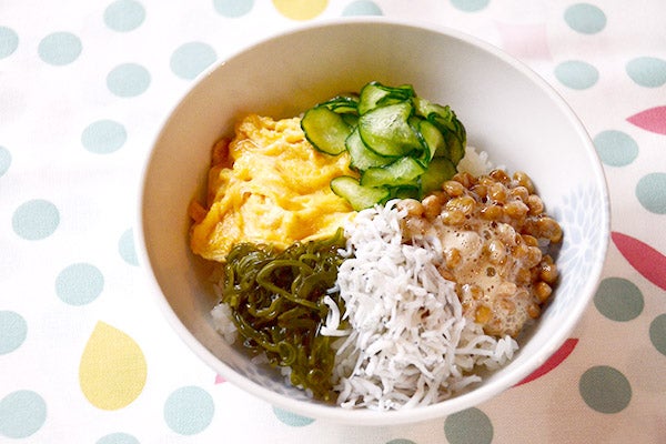 そして、子どもたちが小さいころにわが家で本当によく登場したのが、きゅうりの塩もみを使ったこちらの丼ぶり。炒り卵を作り、冷蔵庫にあるものをのせて混ぜるだけのぶっかけごはんですが、混ぜるのでいろいろな食材が子どもにも食べやすく、とっても美味しい。朝ごはんにはもちろん、本当に時間がないときには晩ごはんにもばっちり。いろいろな食材をのせるので、栄養は大丈夫、と安心できるのも嬉しいポイントです。