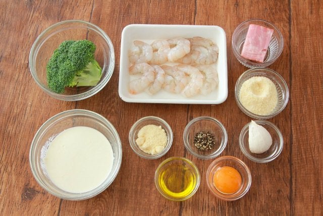 ① ブロッコリーは小房に分け、耐熱ボウルに入れてふんわりラップをし、600Wの電子レンジで3分加熱する。ニンニクは薄切り、ベーコンは1cm幅の拍子切りにする。② ボウルに卵黄、生クリーム、粉チーズを入れて混ぜ合わせる。