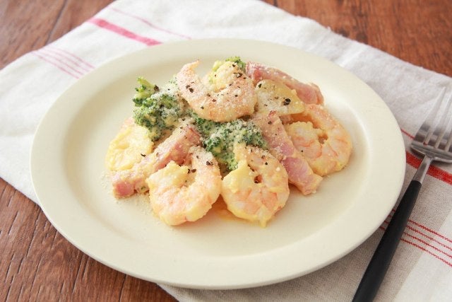 厚切りベーコンとジューシーなエビの「エビの濃厚カルボナーラ炒め」