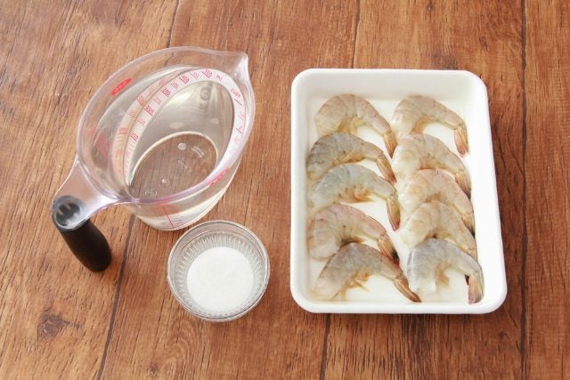 “肉の筋繊維をやわらかくして水分を吸収しやすくする”というテクニックだが、実は鶏肉だけでなく、ブライニングはエビにも有効! 水と塩の「ブライン液」に漬けることで、エビのタンパク質が分解されて水分が浸透するため、加熱しても縮みにくくプリップリなエビになる。