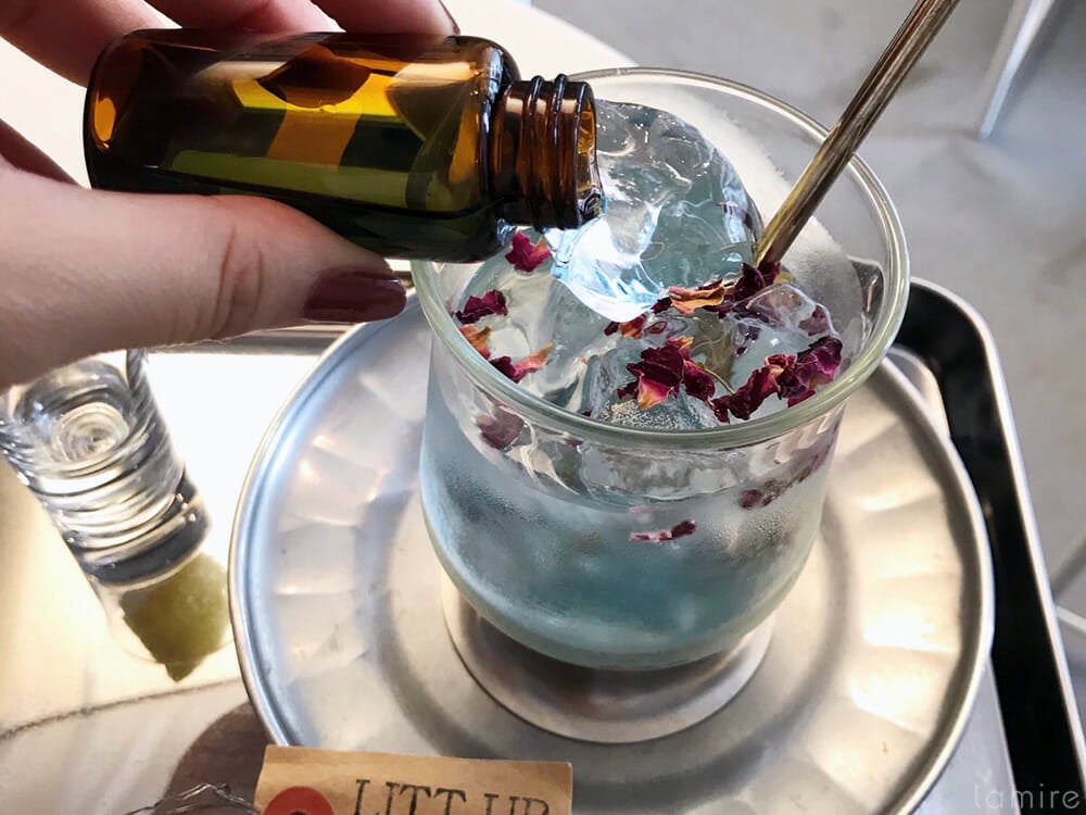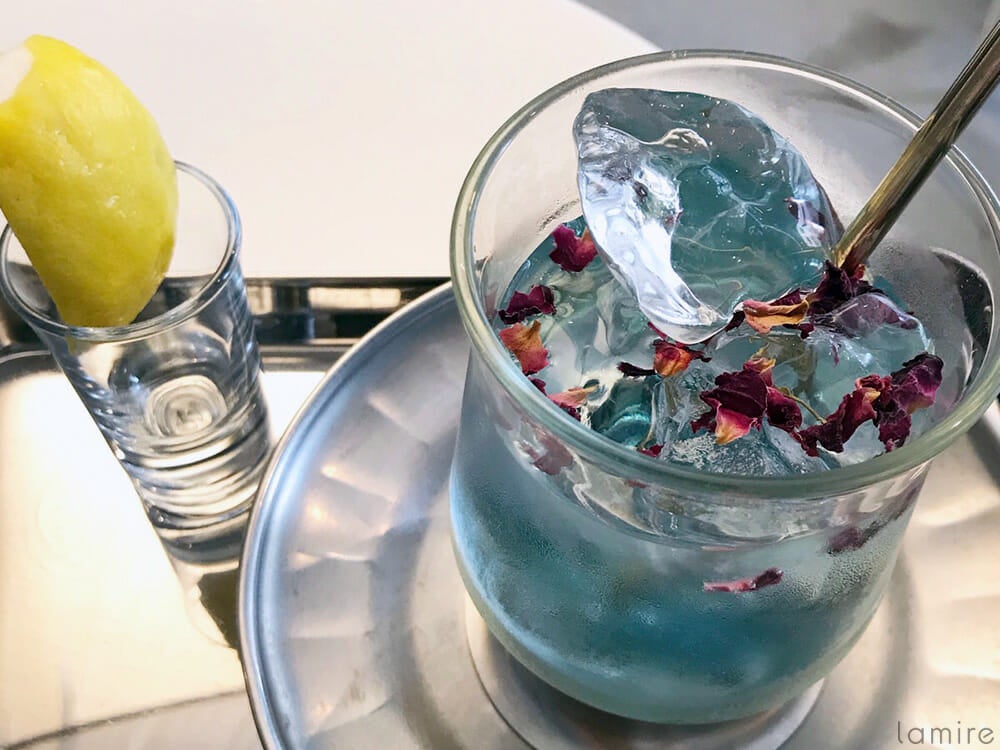 今度はとてもきれいな紫色に♡理科の実験をしているような気分です(笑)。ドリンクに浮かべられたお花もとってもおしゃれですよね。