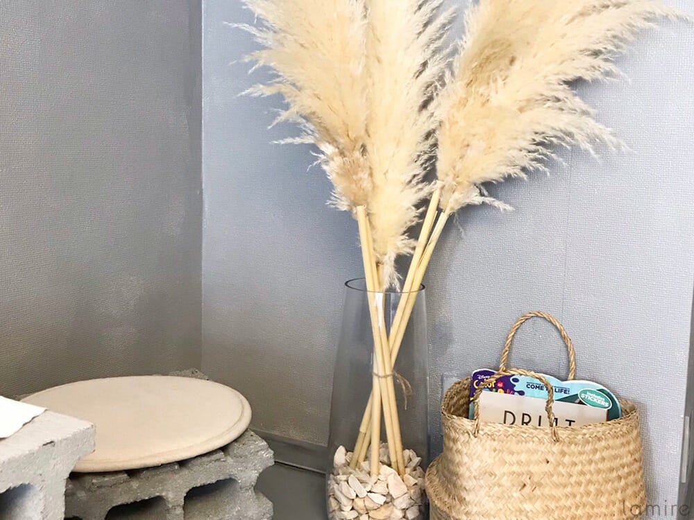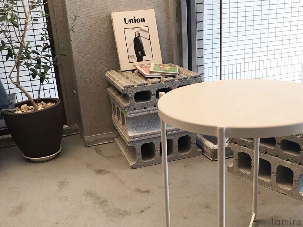 ブロックを使ったテーブルやイスにおしゃれな本がディスプレイされていて、フォトスポットがたくさんあります。