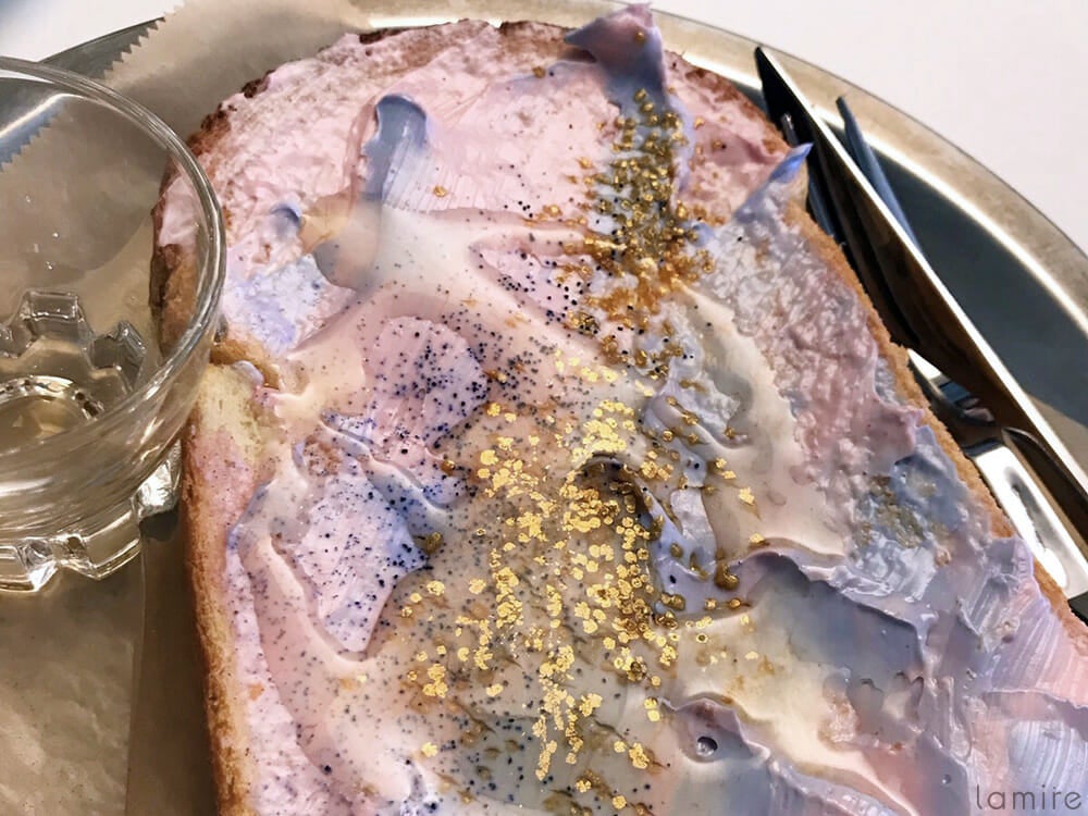 クリームチーズたっぷりな、なんとも色鮮やかなトーストも大人気。このきれいな色は天然の素材でカラーリングしているそう。インスタ映えだけじゃなく、安心して食べられるのも嬉しいですよね。
