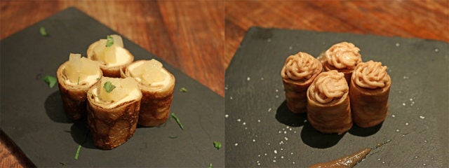 「洋ナシが乗ったクレープの中には、ブロンズチョコを。マロンクリームをあしらったクレープは、ブラックチョコのクリームを詰め込んでモンブラン仕立てにしました」。甘く香ばしいニュアンスのブロンズチョコを使って、高城さんは同店特製の塩バターキャラメルのクレープへオマージュする。