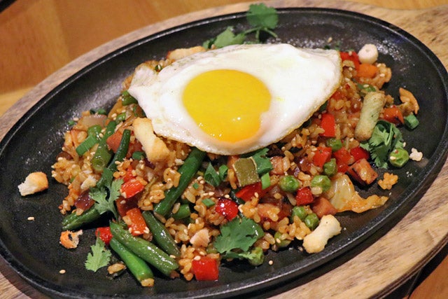 目玉焼きをトッピングした具だくさんのキムチフライドライスはスパムや野菜のほかに、なんとあられが入っているんです。香ばしさと食感アップでいい感じ。