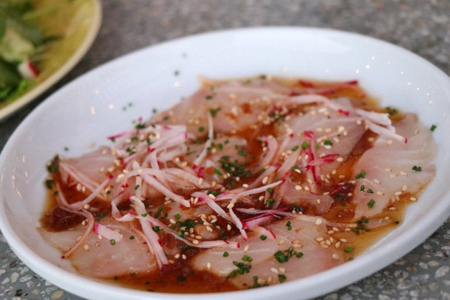 脂がのったコナカンパチの刺身は柚子胡椒のポン酢でいただきます。シャキシャキのラディッシュがいいアクセントでした。