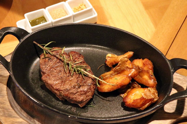こちらは上質なアンガスビーフを使ったステーキ。チミチュリソース、シーソルト、ガーリックチップがサイドに添えられています。付け合せのポテトがびっくりするほどおいしかった。