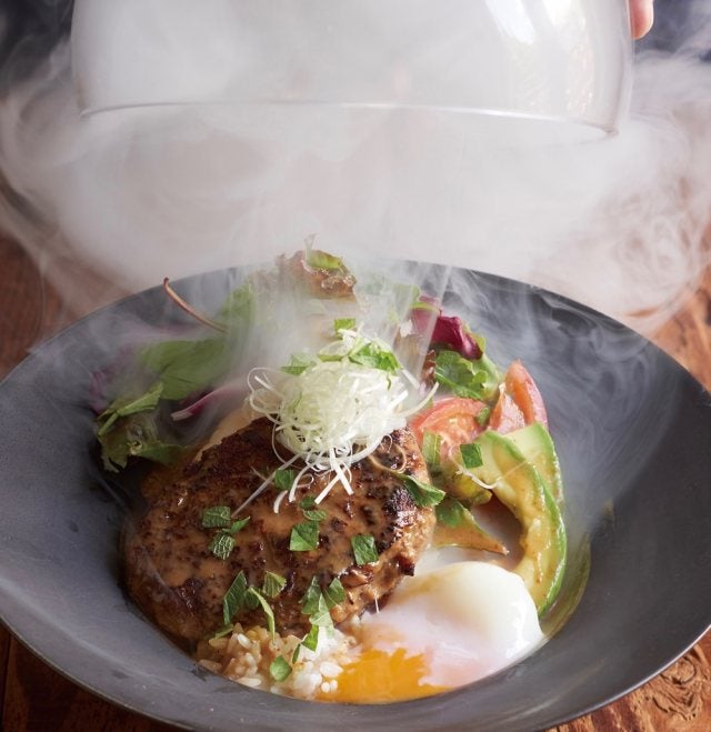 こちらも人気のメニューで、燻製されたスモークで香りづけされたハンバーグ。見ても食べても楽しい一品です。添えられている野菜もたっぷりあって嬉しいですよね。