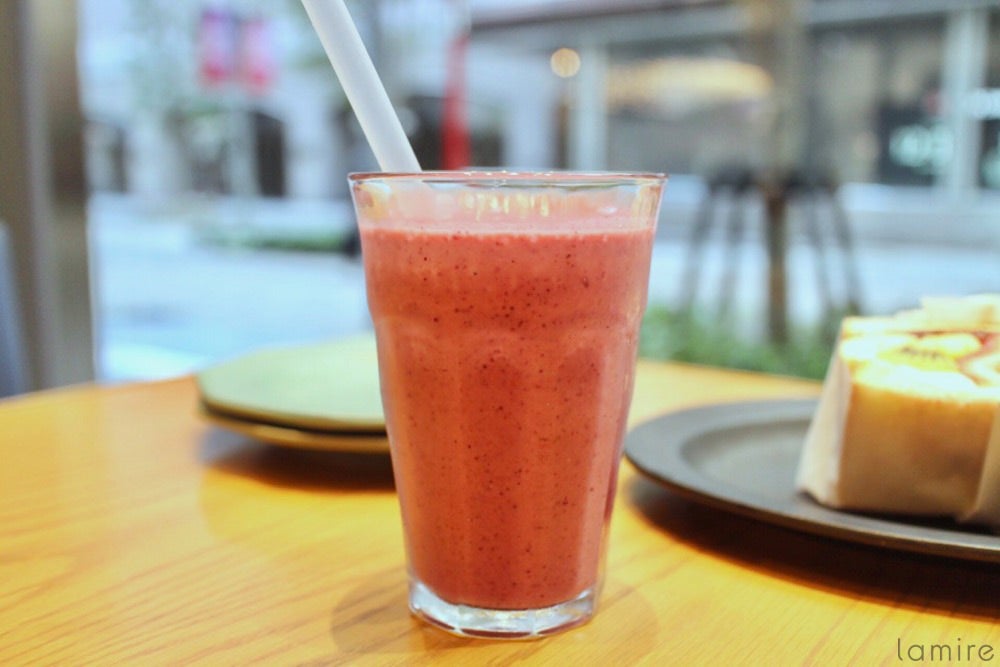 鮮やかなスムージーも一緒にオーダー。ベリーがふんだんに入ったスムージーは見た目も鮮やかなピンクでかわいい!キハチカフェのメニューは、野菜やフルーツをふんだんに使ったものが多く、女性にうれしいメニューやドリンクが揃っているのもうれしいところだなと思いました♪