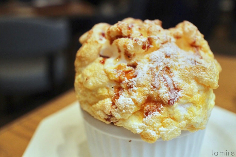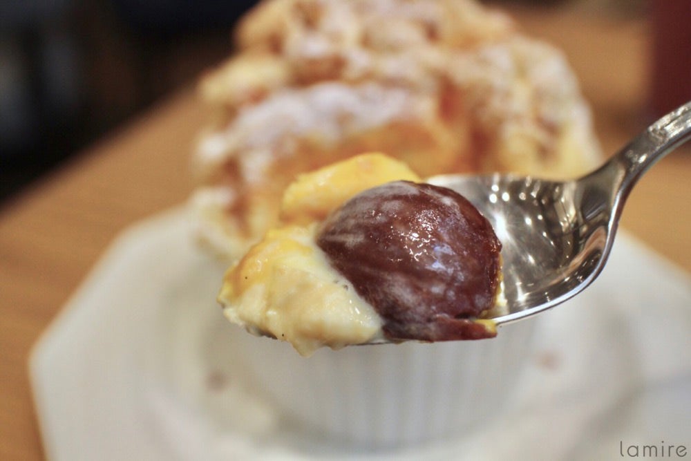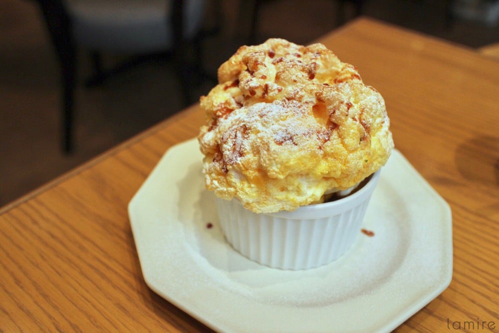 スフレの中は、ベースにプリンがあり、更にパンプキンモンブラン、渋皮栗、バニラアイスが入っています♪次は何が出てくるのかぁと想像しながら食べるのも楽しい!温かいのと冷たいのがどちらも楽しめる贅沢スイーツでした。パンプキンや栗が入っているメニューは秋の限定で、11月いっぱい楽しめるそうです。12月1日〜2月末日までは、いちごが入ったものが冬季限定メニューとして出るそう。どちらもぜひ体験したいですね。