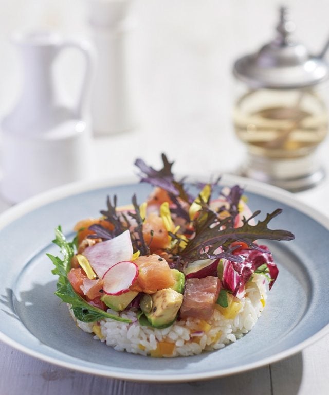 キハチ カフェでは食事メニューも充実しています。マグロとアボカドのサラダごはんはまるでお花畑のような彩り。盛り付けひとつ取っても、シェフのこだわりが詰まっています。