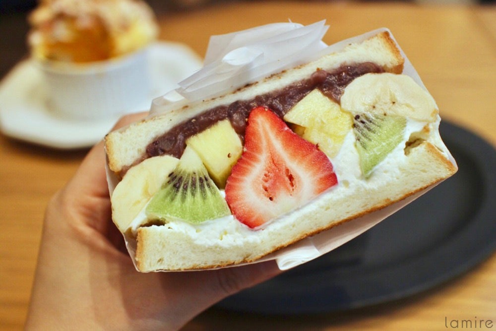 今回、狙っていたのはこのフルーツサンド!大きめにカットされたフルーツがゴロゴロ入っていて、なんといってもこの断面がたまらないですよね。フルーツは、いちご、キウイ、パイナップル、バナナが入っていて、それらを包み込んでいるのが、あんことマスカルポーネクリーム。計算された絶妙なバランスです。