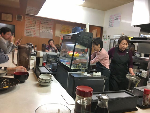 ここのとん汁は単品300円だが、定食なら+100円で味噌汁をとん汁に変えてくれる。具沢山で、通常でもかなりの量の豚肉が入っているここのお味噌汁、とん汁にして大丈夫だろうか。そう思いながら、豚の生姜焼をアテにサワーを飲んでいると、女性たちの丼と皿がどんどん空になっていく。