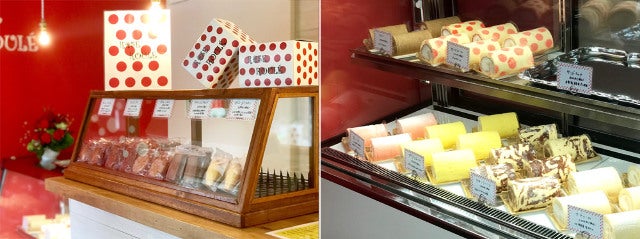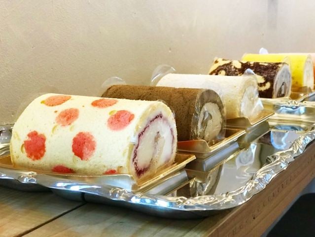 明るい店内は気軽に入りやすい雰囲気で、ショーケースには色鮮やかなロールケーキと焼き菓子が並ぶ。