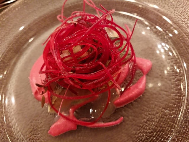 この日は、ゴマサバをメインに新高梨と燻りがっこという複雑なうまみの料理(写真上)だったが、あわせると軽やかに感じた。兵庫・山田錦でもこういう表現ができるのかと感心。爽やかな中にも濃密なフルーツも感じられる。グラスはしっかりしたものではなく、薄はりのシャルドネグラスだとより繊細な官能という相反する面白さが感じられるかもしれない。