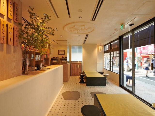 真っ白な漆喰の壁に、ソフトクリームを上から見た形を表したマークを染めた藍色ののれん、和の雰囲気をつくるベンチやライトが店の外に並ぶ。店内には、木札のメニュー、大きい畳のベンチなどが存在感たっぷりに配置されている。
