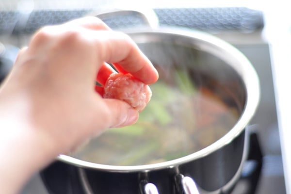 鶏団子は鶏ひき肉をそのまま丸めたものを入れています。鶏ひき肉をそのまま団子にしておいしいの!? と思われるかもしれませんが、これが簡単でおいしいのです。ネギや卵や片栗粉などを入れなくても、臭みがなくやわらかいお団子になります。