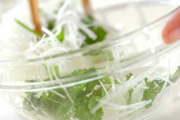 ・香菜は長さ3cmに切って水洗いし、白髪ネギと合わせる。